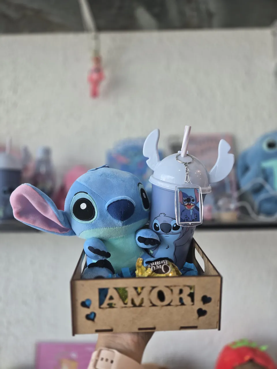 Encante-se com a cesta Stitch! Essa fofura inclui um adorável pelúcia Stitch e um copo temático, perfeitos para os fãs do personagem. Um presente cheio de amor e magia!
