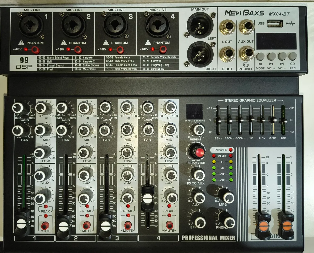 4 canais: Entradas para microfones (XLR) e instrumentos (P10), com controles individuais de ganho, graves e agudos. Possui equalizador gráfico.