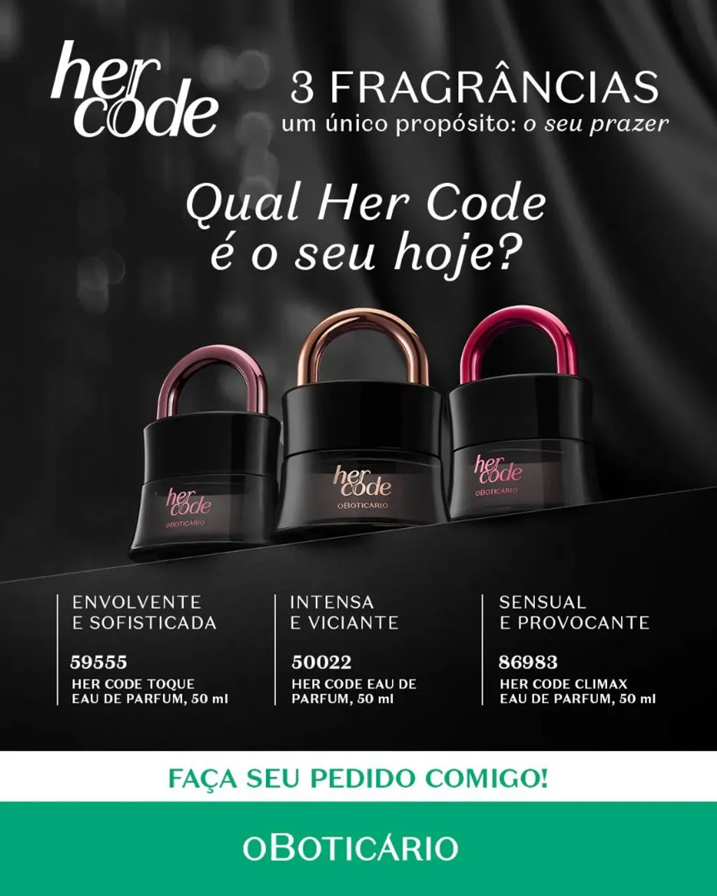 Descubra a fragrância perfeita para cada momento com Her Code! Envolvente, intensa ou sensual, escolha a sua e deixe sua marca por onde passar.