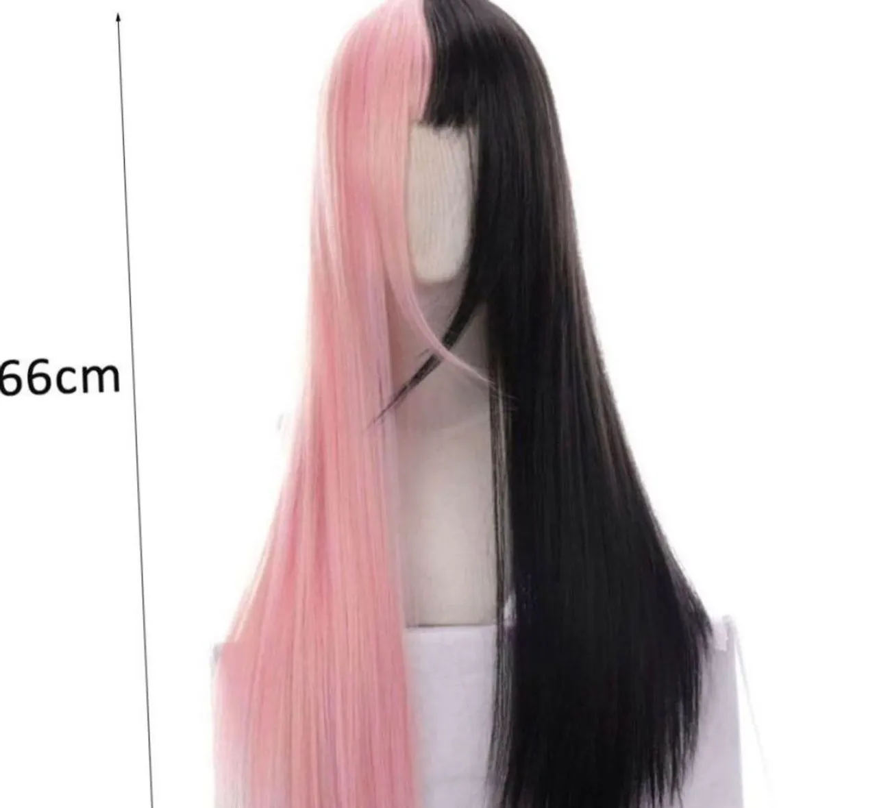 Peruca metade bicolor preta e rosa! Perfeita para cosplays, festas temáticas ou para dar um toque de ousadia ao seu dia a dia. Cabelos longos