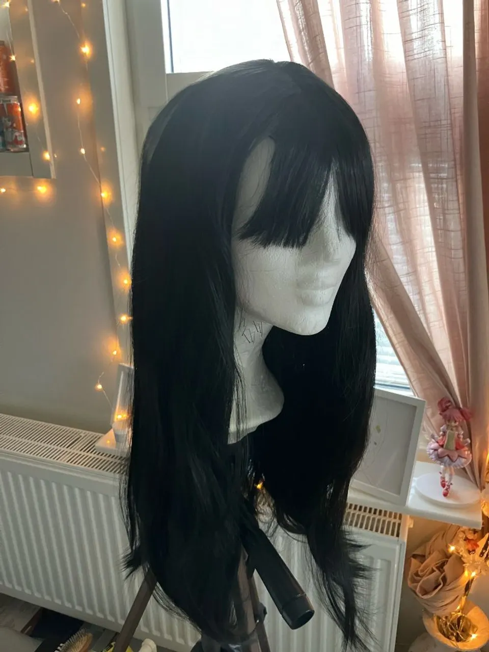 Peruca preta longa com franja, ideal para cosplays, fantasias e dia a dia. Cabelo liso macio e com bom caimento, proporcionando um visual autêntico e estiloso.