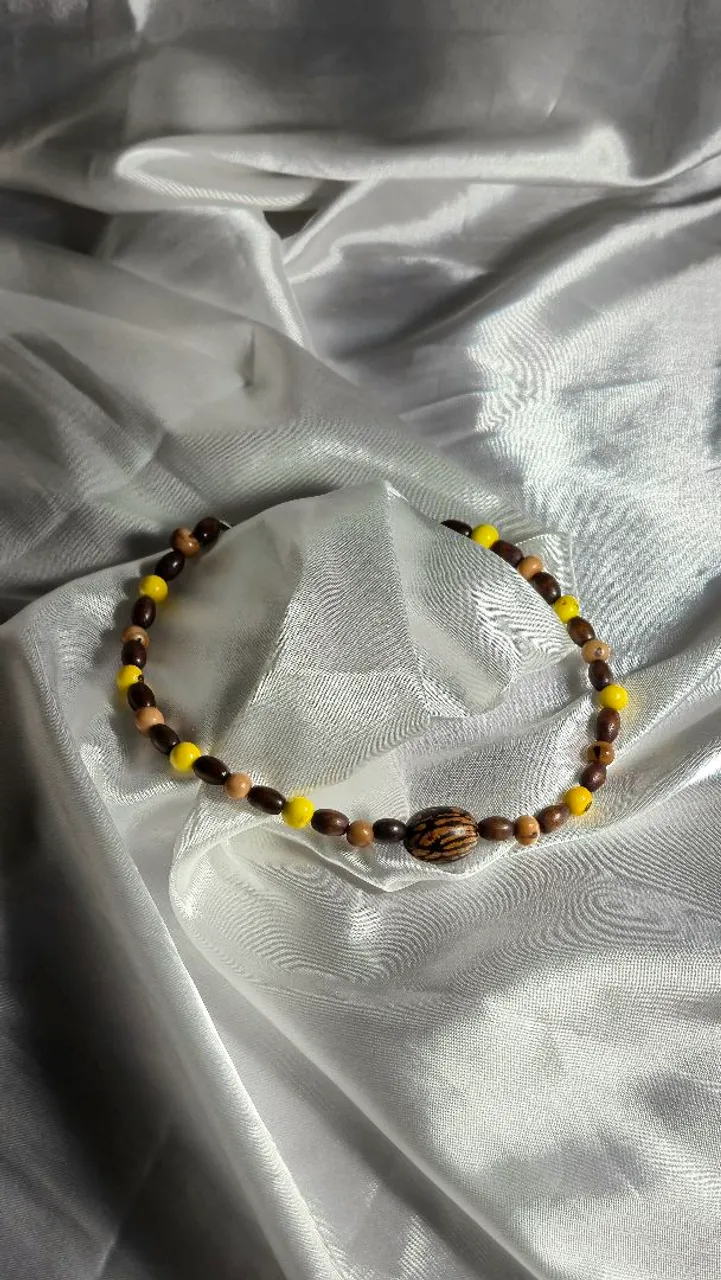 O colar borboleta do coqueiro foi inspirado em uma borboleta do mesmo nome, suas cores vibrantes que unem a vivacidade com o casual perfeito para todos os momentos, foi feito a partir das sementes de açaí tingido de amarelo, bege com miçangas de madeira e como principal elemento a semente de pachubá