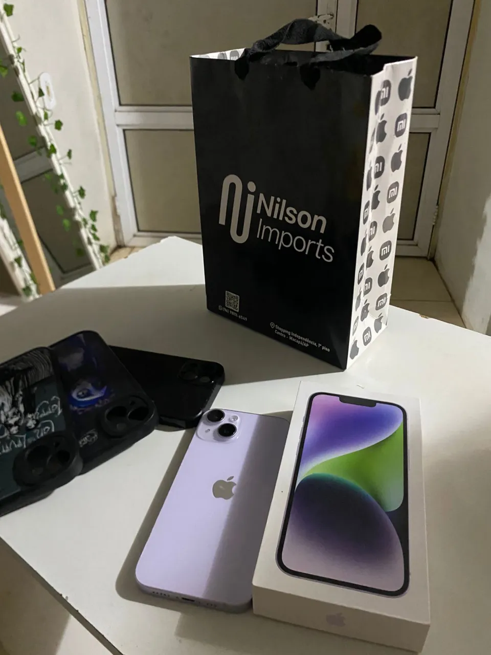 iPhone 14 - 128GB Roxo - Completo ? Cor: Roxo ? 128GB ? Saúde da bateria: 77% ? Sempre com capa e película ? Leves marcas de uso (normais) ? Cabo original + caixa ? Nota fiscal ? Acompanha 3 capinhas ? Funcionando 100% ? R$ 2.700