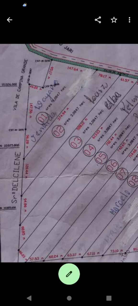 Venda de terreno:medindo (78,17 Frente) (120,44 Fundos)/(374,00 Lateral Direita) (504,00 Lateral Esquerda), sendo (3,0847 hectares em Vila de Campina Grande. Rodovia/Macapá/Jari (asfalto passa na frente) Esta venda é do lote (02)