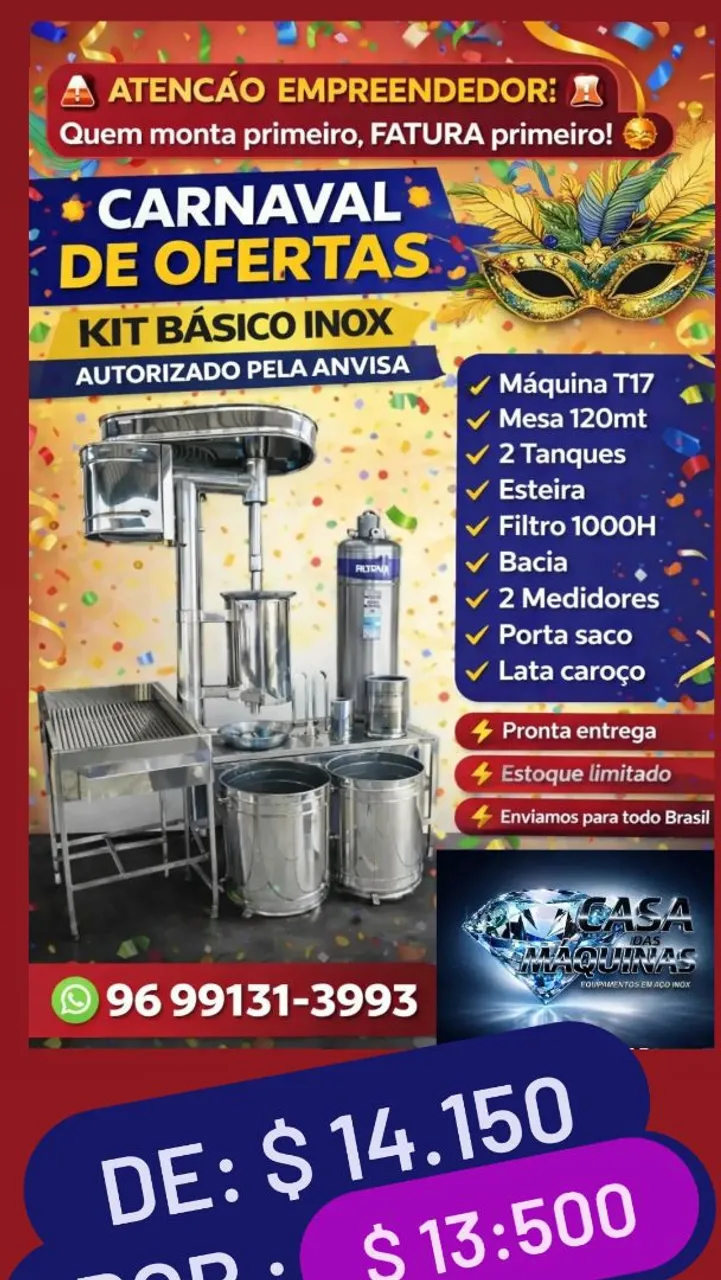 Aproveite as ofertas de carnaval e monte seu ponto de açaí com o Kit Básico Inox! Composto por máquina T17, mesa de 120mt, 2 tanques, esteira, filtro 1000H, bacia, 2 medidores, porta saco e lata caroço. Produto autorizado pela Anvisa. Pronta entrega e estoque limitado. Enviamos para todo Brasil.