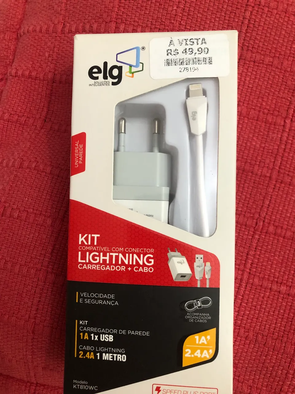 Kit carregador de parede com conector Lightning. Carregamento rápido e seguro. Acompanha cabo de 1 metro e organizador de cabos.
