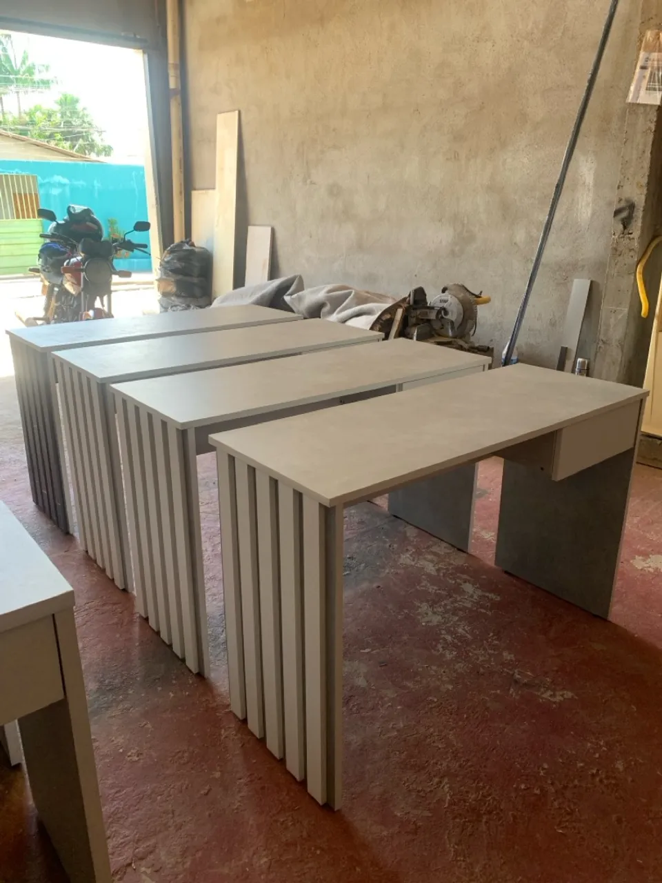 Mesas no tamanho de 1.20 largura X 75 altura X 45 de profundidade Com uma gaveta e ripado na lateral, mesa nova, em Mdf de 25 e 18mm. Cores iguais. 550,0 unidade Cartão até 3x sem juros.