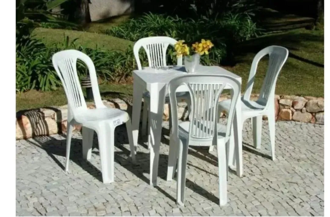 Conjunto de mesa plástica, ideal para áreas externas, resistente e fácil de limpar. Perfeito para momentos de lazer e refeições ao ar livre. Usada mais conservada valor 230 reais o jogo tenho 5 jogos pra vender.