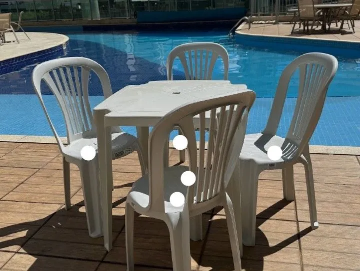 Conjunto de mesa de plástico perfeito para áreas externas como varandas e jardins. Resistente e fácil de limpar, ideal para momentos de lazer e refeições ao ar livre.