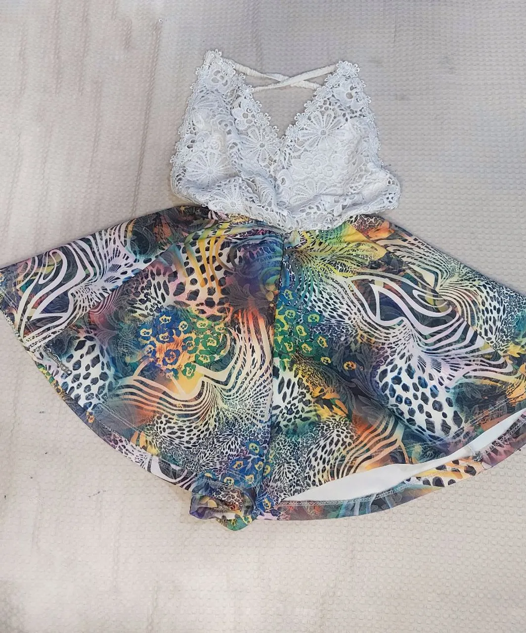 Macacão parte de cima branco com renda e short estampada, perfeito para um look casual e estiloso. Ideal para o dia a dia ou para um evento especial.